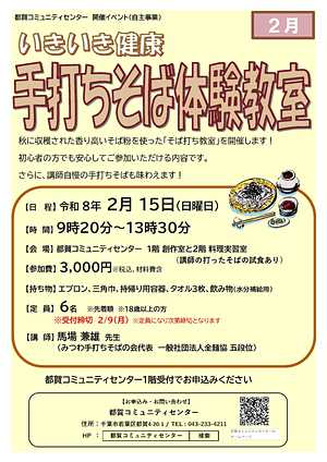 手打ちそばの体験教室を実施します。教室では講師の打ったそばを味わい、ご自身で打ったそばはお持ち帰りになれます。