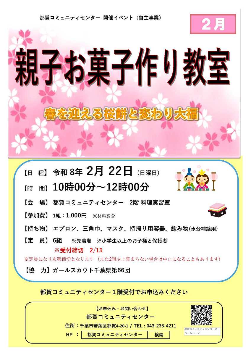 春を迎える桜餅と変わり大福を作ります。詳しくは、添付のポスターをご覧ください。